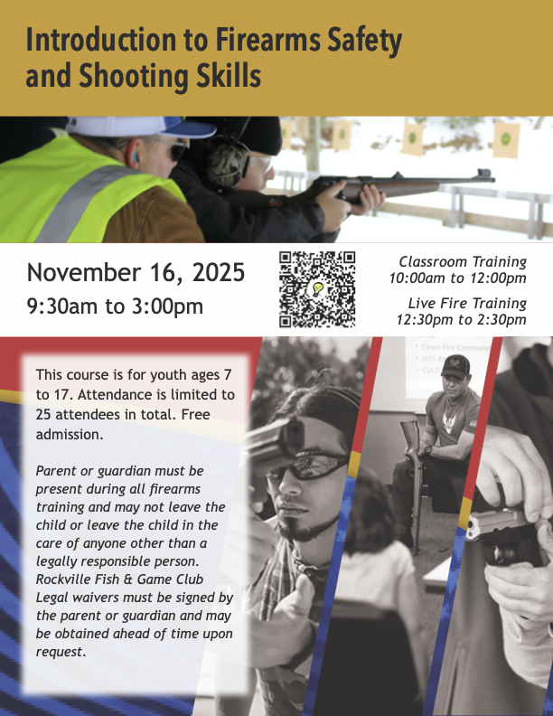 Parent or guardian must be present during all firearms training and may not leave the child or leave the child in the care of anyone other than a legally responsible person. Rockville Fish & Game Club Legal waivers must be signed by the parent or guardian and may be obtained ahead of time upon request. Please use a separate form per participant.